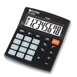 Kompaktní stolní kalkulátor se základními funkcemi a mírně nakloněným displejem.