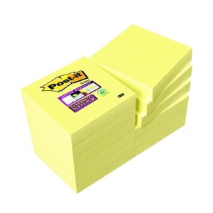 Silně lepicí bločky Post-it Super Sticky v tradiční žluté barvě Splňují certifikaci PEFC Vhodné na lepení ve vertikální poloze, např. na monitor Rozměry: 47,6 x 47,6 mm Balení: 12 x 90 lístků