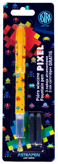 Plnící pero ASTRA Pixel: - hrot zakončený iridiovou kuličkou, - výjimečná trvanlivost a snadné psaní, - výměnné inkoustové bombičky.
