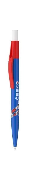 Mechanické kuličkové pero ICO s potiskem v národních barvách s tématem fotbalu. Šíře stopy: 0,8 mm; délka stopy: 2500 m; barva náplně: modrá.