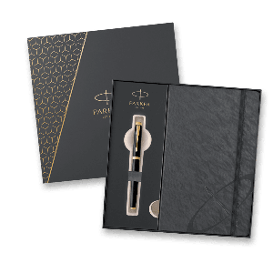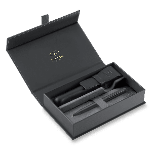 Dárková kazeta s rollerem Parker IM Black GT s mosazným tělem a víčkem s lesklou černě lakovanou povrchovou úpravou.