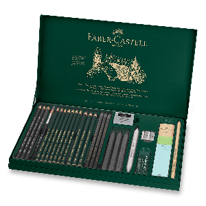 Grafitová tužka Castell 9000 a Pitt Monochrome s doplňkovým příslušenstvím v odolné plechové krabičce.