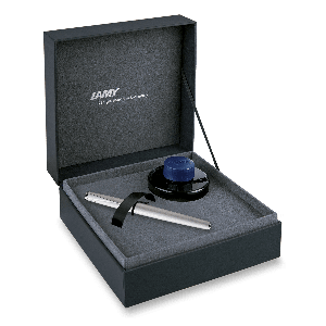 Dárková kazeta s inkoustem a plnicím perem Lamy Studio Brushed Steel.