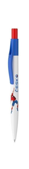 Mechanické kuličkové pero ICO s potiskem v národních barvách s tématem fotbalu. Šíře stopy: 0,8 mm; délka stopy: 2500 m; barva náplně: modrá.