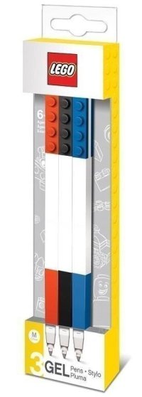 Trojice LEGO gelových per různých barev (červená, modrá, černá).