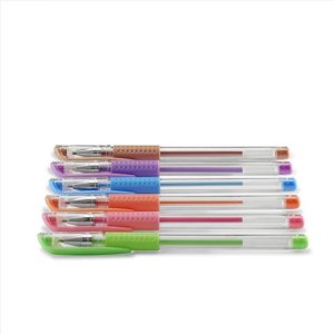 6 gelových per, neonové třpytivé barvy + stříbrná, 0,8 mm a 1,0 mm, světlostálý inkoust.