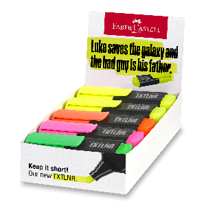 Plochý zvýrazňovač Faber-Castell Short TXTLNR SF ve 4 neonových odstínech.