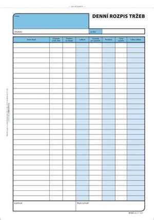 tzv. košilkanepropisovacínečíslovanáformát 29,7 x 14 cm na šířkuobsahuje 100 listů odtržitelných perforací, se zakládacím děrováním