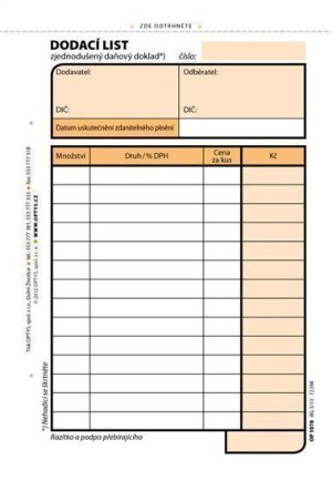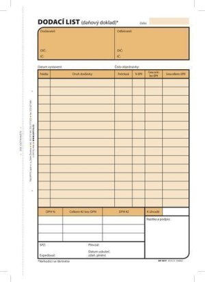 Popis produktuDodací list - daňový doklad•tiskopis splňuje všechny platné požadavky zákona o DPH•nepropisovací•nečíslovaný•formát A5 na výšku•obsahuje 100 listů odtržitelných perforací, se zakládacím …