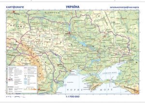 Oboustranná nástěnná mapa nabízí na jedné straně mapu Ukrajiny v českém jazyce a na druhé straně území této východoevropské země v ukrajinštině.