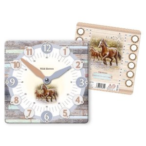 Papírové dětské hodiny na výuku Wild horses. • obsahují ciferník se zvýrazněnými čísly 3, 6, 9 a 12 také čísla od 1 po 12 a minutové dělení s pohyblivými ručičkami • zadní strana …