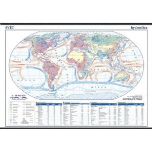Mapa světové hydrosféry přehledně zobrazuje nejdůležitější vodní toky a plochy světa, vymezuje hlavní světová úmoří a zobrazuje směr a charakter mořských proudů.