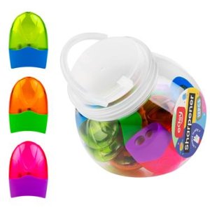 Dvojité školní ořezávátko s praktickým víkem a kontejnerem, v barevném mixu.