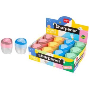 Dvojité plastové ořezávátko se zásobníkem; Barevné a praktické; Ořezávátko je nezbytnou součástí vybavení každého, kdo používá tužky nebo pastelky.