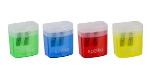 Dvojité školní ořezávátko s praktickým víkem a kontejnerem, v barevném mixu.