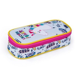 Školní pouzdro etue je opatřeno pevnými zipy, kapsičkou na zip a klopou s pevnými poutky po obou stranách.