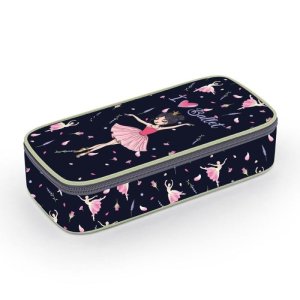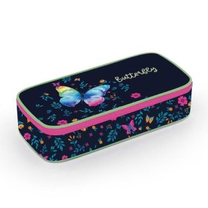 Školní pouzdro je opatřeno pevnými zipy, uzavíratelnou kapsičkou na zip, přihrádkou na pravítko a klopou s šesti poutky na psací potřeby.
