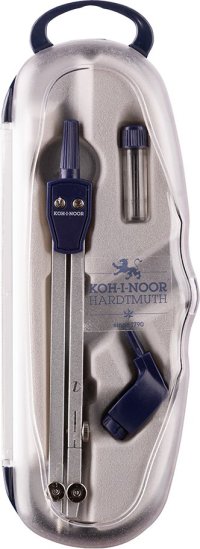 Školní kovové kružítko určené k rýsování kružnic do průměru 360 mm s upínacím průměrem 3,5 mm včetně tuženky s 2 náhradními tuhami a univerzálního nástavce (adaptéru) v krabičce z tvrdého plastu.