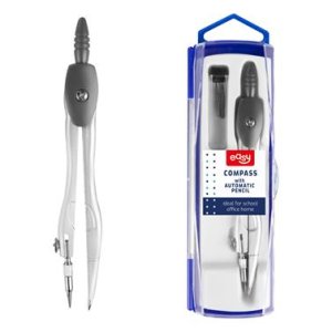 Školní kovové kružítko určené k rýsování kružnic do průměru 360 mm s upínacím průměrem 3,5 mm včetně tuženky s 2 náhradními tuhami a univerzálního nástavce (adaptéru) v krabičce z tvrdého plastu.