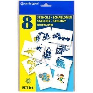 Kreslící šablonky s motivem dopravních prostředků a lidí.