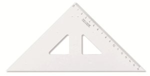 Trojúhelník 45/177 vyrobený z čirého průhledného polystyrenu, ve středu opatřený bílým polystyrenovým držadlem je vhodný pro rýsování a měření přímek, kolmic, úhlů, rovnoběžek apod.