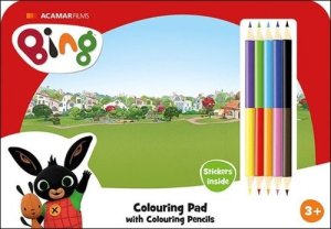 Set obsahuje 6 omalovánek, 12 prázdných listů ke kreslení, list samolepek a 5 oboustranných pastelek.