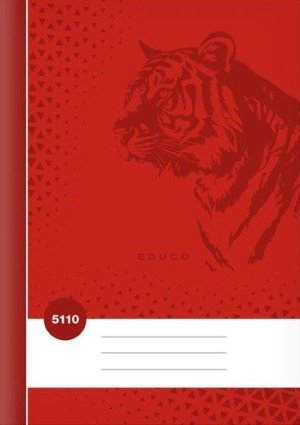 Školní sešit ve formátu A5, čtverečkovaný, v červené barvě, s motivem tygra, v deskách z křídového papíru.