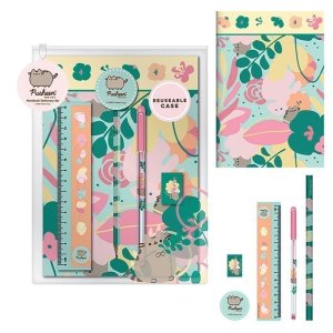 Školní set Pusheen.Obsah:zápisník A5pravítko 15 cmtužkagumaořezávátkopero
