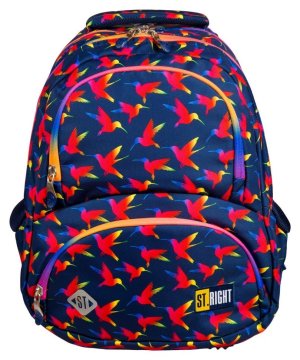 Čtyřkomorový školní batoh v modré barvě s duhovými zipy a originálním motivem Rainbow Birds!
