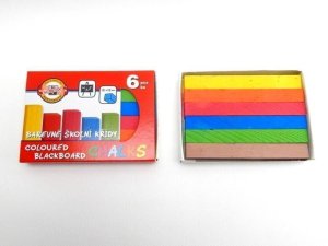 Souprava 6 kusů školních barevných čtyřhranných kříd o rozměrech 12x12x100 mm, které jsou určeny pro psaní na školní tabule, vložených do krabičky s potištěnou manžetou.