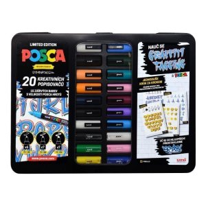 Limitovaná edice Posca Graffiti Tagging obsahuje 20 různobarevných popisovačů ve velikostech 1M, 3M a 5M, exkluzivní vzory od umělce SPZero, barevné návody dvou graffiti stylů a cvičné listy.