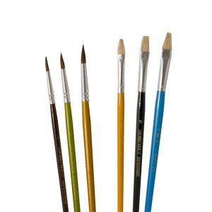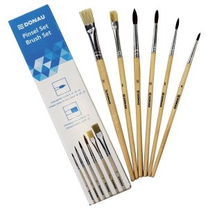 Kvalitní štětce s přírodním vlasem a dřevěnou lakovanou násadkou Ploché štětce jsou vyrobeny z vepřové štětiny, kulaté štětce z koňské žíně Balení obsahuje 6 štětců: kulatý č. 4, 6, 8 a plochý č. 8, …