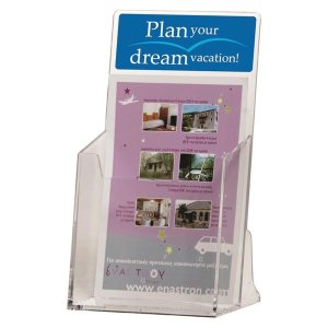 Jednoduchý stojan z průhledného akrylátu na dokumenty a katalogy s jednu přihrádkou Možnost zavěšení na stěnu (spojovací materiál není součástí dodávky) Rozměr: 17,0 x 8,7 x 20 cm Hloubka přihrádky 9,4 …