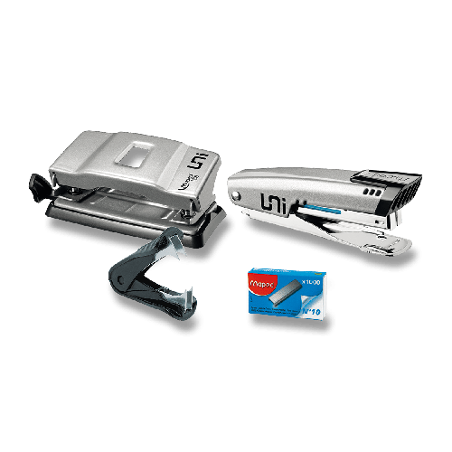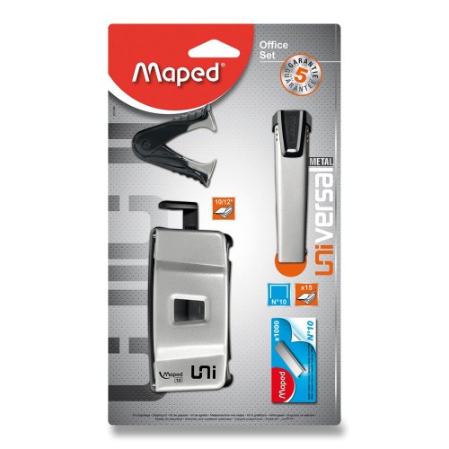 Sešívačka Universal Pocket No. 10, * hloubka vkládání papíru 40 mm, * balení obsahuje 400 ks drátků, * záruka 5 let, * drátky Maped No.10 na 15 listů, Děrovačka Universal, * rozteč mezi otvory 8 cm, * záruka 5 let, * na 10 listů papíru 80 g/m2 nebo na 12 listů papíru 70 g/m2, Rozešívač,
