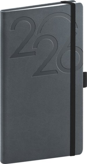 Kapesní diář Ajax 2026 v černé barvě. Jemně strukturovaný povrch s atypickým reliéfem je vhodný pro všechny typy ražeb. Diář má zakulacené rohy, poutko na tužku a elastickou gumičku. Týdenní rozvrh s česko-slovenským kalendáriem a doplňkovou angličtinou, němčinou, maďarštinou a ruštinou.