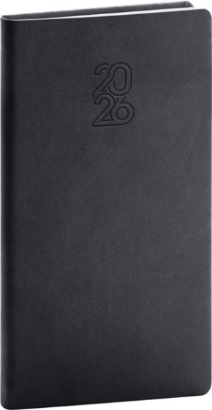 Kapesní diář Aprint 2026 v černé barvě. Kolekce vsadila na osvědčené barvy, které doplňuje nová ražba letopočtu. Týdenní rozvrh s česko-slovenským kalendáriem a doplňkovou angličtinou, němčinou, maďarštinou a ruštinou.