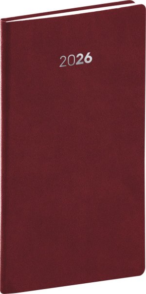 Plánovací kapesní diář Balakon 2026 v provedení bordó, doplněný o stříbrný letopočet.