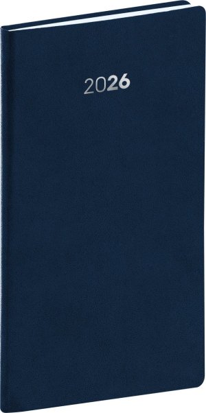 Plánovací kapesní diář Balakon 2026 v tmavě modrém provedení, doplněný o stříbrný letopočet.