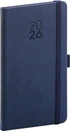Kapesní diář Diamante 2026 v modré barvě. Povrch diáře má jemnou strukturu připomínající výbrus diamantu a je ideální pro všechny typy ražeb. Diář má zakulacené rohy, poutko na tužku a elastickou gumičku. Týdenní rozvrh s česko-slovenským kalendáriem a doplňkovou angličtinou, němčinou, maďarštinou a ruštinou.