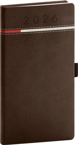 Kapesní diář Tomy 2026 v hnědo-červené barvě. Klasický povrch imitující kůži, který doplňuje jemné prošití. Na materiál lze tisknout a je vhodný pro všechny typy ražeb. Týdenní rozvrh s česko-slovenským kalendáriem a doplňkovou angličtinou, němčinou, maďarštinou a ruštinou.