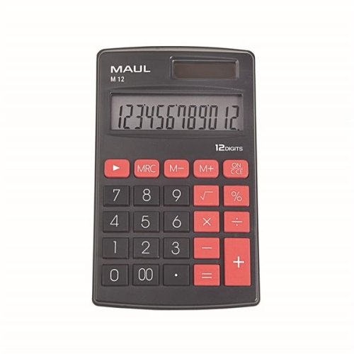 Praktická kapesní kalkulačka MAUL kvality s velkým 12místným displejem, která se vejde se do každé tašky, aktovky, brašny nebo batohu