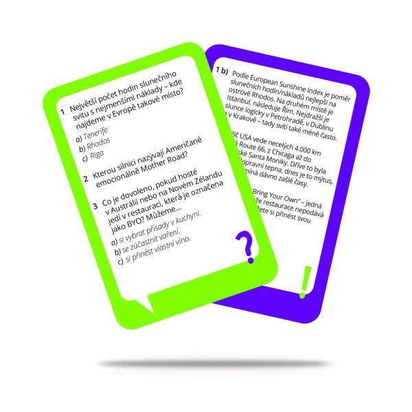 Na každé kartě vás čeká trojice otázek, pro odpovědi stačí otočit. Zjistěte, kdo z party toho ví o světě víc a zabavte se jak na cestách, tak třeba při přátel