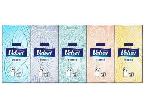 Jemné hygienické kapesníky Velvet classic se skládají ze tří vrstev měkkého papíru. Kombinace pěti optimistických vzorů s designem přinášejícím pozitivní emoce, a s klipem, který se pohodlně otevírá, získá uznání i u těch nejnáročnějších zákazníků, kteří si, kromě praktických vlastností, cení i elegantního vzhledu. Nové kapesníky Velvet classic mají výjimečný, jemný vzor na okraji kapesníku s motivem květin, díky čemuž je kapesník ještě měkčí. Výrobek má atest PZH.