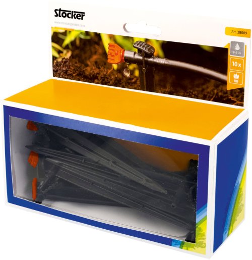 Nastavitelný kapakovač uvolňuje po kapkách správné množství vody pro sazenice. Otáčením barevného ventilu je možné regulovat průtok od 0 do 6 litrů za hodinu. Instalujeme zabodnutím ostrého konce kolíku do půdy.