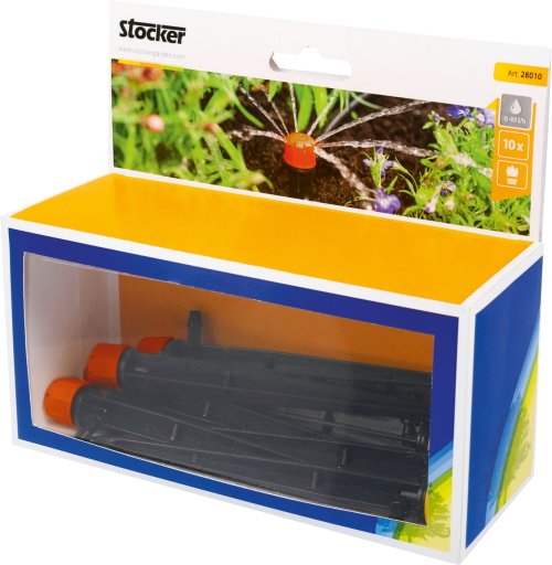 Tento nastavitelný kapkovač je vhodný pro rostliny, které vyžadují větší přísun vody. Díky 8mi otvorům v hlavici se může uvolňovat od 0 do 40 litrů za hodinu. Průtok upravíte jednouše otočním berevné hlavy. Instalujeme zabodnutím ostrého konce kolíku do půdy.