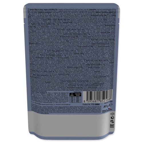 | Složení: | Maso a výrobky živočišného původu (81 % ve filetkách*), ryby a vedlejší výrobky z ryb (10 % maso z bílých ryb ve filetkách*), bílkovinné extrakty, vedlejší výrobky rostlinného původu (0,4 % inulin), minerální látky, cukry. *Filetky obvykle tvoří 44 % produktu. |