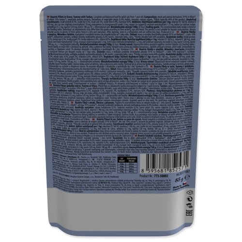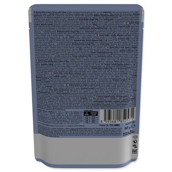 | Složení: | Maso a výrobky živočišného původu (91 % ve filetkách*, z toho 10 % krůtí*), bílkovinné extrakty, vedlejší výrobky rostlinného původu (0,4 % inulin), minerální látky, cukry. *Filetky obvykle tvoří 44 % produktu. |