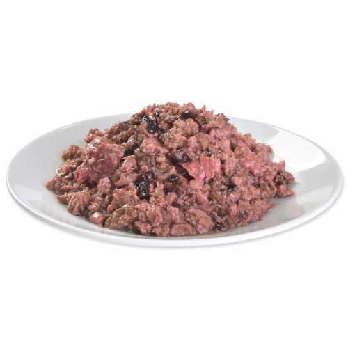 Složení: 85 % maso a vedlejší výrobky živočišného původu ve filetech (8 % jehně), 9,6 % masová šťáva, 1,5 % byliny a ovoce (hřebíček, citrusy, rozmarýn, kurkuma), 0,5 % borůvky, 1 % minerály, 1 % lososový olej, 0,5 % mannan-oligosacharidy, 0,5 % frukto-oligosacharidy, 0,4 % inulin. Analytické složky: hrubý protein 9 %, hrubé oleje a tuky 4 %, hrubý popel 2,2 %, hrubá vláknina 0,4 %, vlhkost 82 %, vápník 0,3 %, fosfor 0,2 %, sodík 0,5 %. Nutriční doplňkové látky na 1 kg: vitamín D3 (E671) 250 m.j., vitamín E (3a700) 100 mg, zinek (3b606) 15 mg, železo (3b103) 10 mg, mangan (3b502) 3 mg, jód (3b201) 0,75 mg, měď (E4) 0,5 mg, biotin (3a880) 0,2 mg. Bez umělých aromat. Bez konzervantů. Metabolizovatelná energie: 815 kcal/kg Krmný návod: