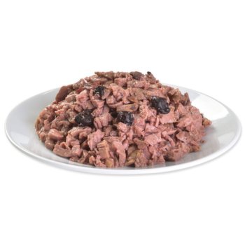 Složení: 85 % maso a vedlejší výrobky živočišného původu ve filetech (8 % jehně), 9,6 % masová šťáva, 1,5 % byliny a ovoce (hřebíček, citrusy, rozmarýn, kurkuma), 0,5 % borůvky, 1 % minerály, 1 % lososový olej, 0,5 % mannan-oligosacharidy, 0,5 % frukto-oligosacharidy, 0,4 % inulin. Analytické složky: hrubý protein 10 %, hrubé oleje a tuky 5 %, hrubý popel 2,3 %, hrubá vláknina 0,4 %, vlhkost 82 %, vápník 0,3 %, fosfor 0,2 %, sodík 0,5 %. Nutriční doplňkové látky na 1 kg: vitamín D3 (E671) 280 m.j., vitamín E (3a700) 120 mg, zinek (3b606) 16 mg, železo (3b103) 12 mg, mangan (3b502) 3,5 mg, jód (3b201) 0,8 mg, měď (E4) 0,6 mg, biotin (3a880) 0,2 mg. Bez umělých aromat. Bez konzervantů. Metabolizovatelná energie: 865 kcal/kg