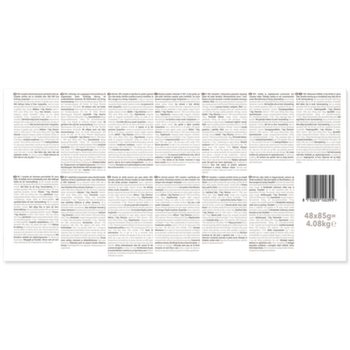 Složení: maso a živočišné deriváty, ryba a rybí deriváty (4% maso z tuňáka, 4% maso ze sledě), deriváty zeleninového původu, minerály. Jakostní znaky: hrubé proteiny 9,2%, vlhkost 79,3%, hrubé oleje a tuky 4,8%, hrubé popeloviny 1,4%, hrubá vláknina 0,4%, vitamín D 200 m.j./ kg, vitamín E 100 mg / kg, měď (síran měďnatý pentahydrát) 1,8 mg / kg, jód (jodid draselný) 0,37 mg / kg, mangan (síran manganatý monohydrát) 2,1 mg / kg, zinek (síran zinečnatý monohydrát) 32 mg / kg. Bez barviv a příchutí.